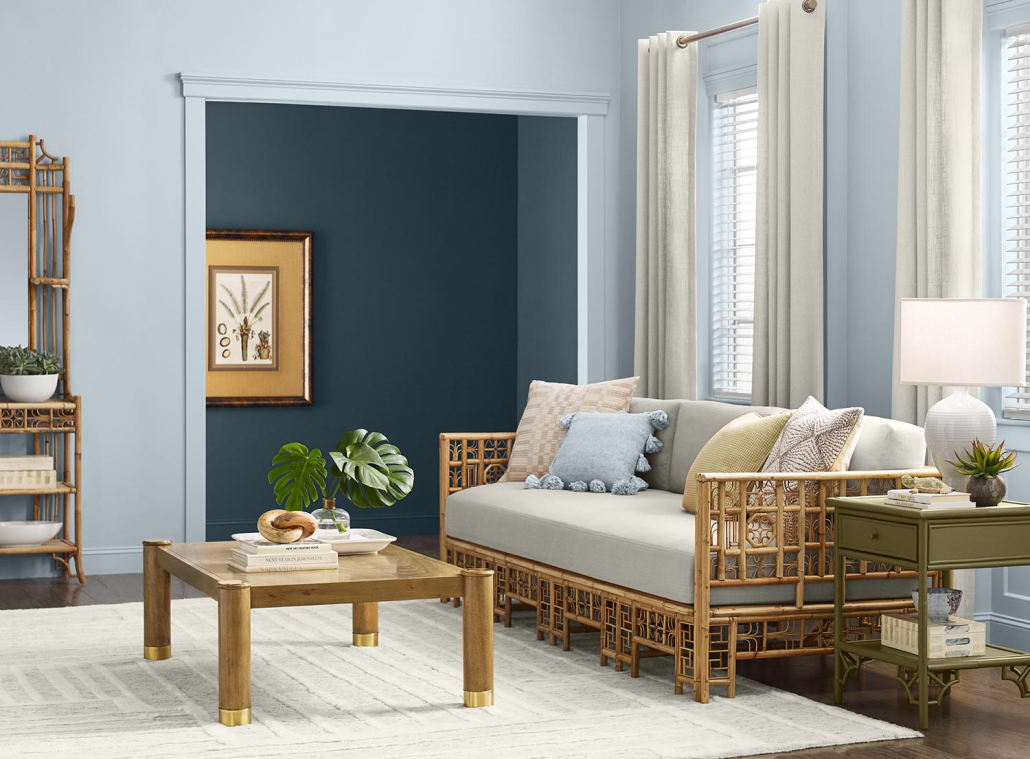 Embrace the simple comfort of a shade that captures the limitless wonder of a bright summer sky. Upward’s breezy, pale hue gently washes living spaces with its buoyant, uplifting energy, effortlessly crafting an airy yet inviting atmosphere. Its serene character, reminiscent of the tranquil beauty of the seaside, is perfect for a coastal-inspired interior. The deep marine-blue of Gale Force – the anchor of this month’s palette – grounds the mostly neutral space, providing balance and a note of cozy moodiness.